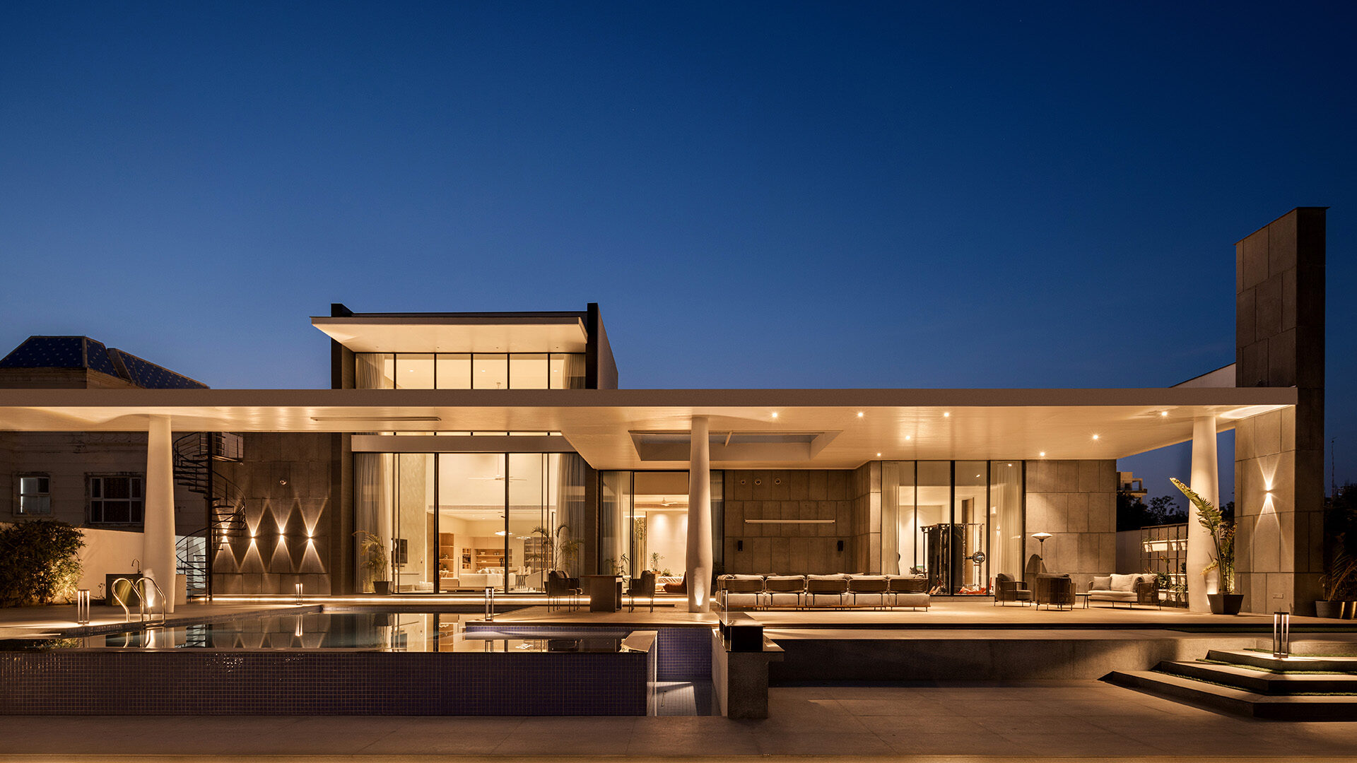 Ananda is a modern residence in Amritsar that masterfully integrates contemporary design with Indian aesthetics, creating a serene retreat where expansive indoor-outdoor spaces and natural beauty seamlessly merge to offer a tranquil and elegant living experience.