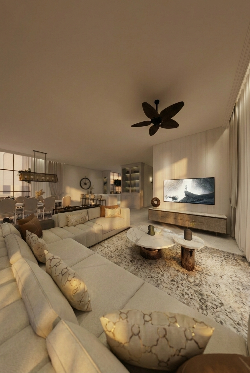 Natural light defines the spatial experience. Large openings, framed views, and layered lighting strategies create a dynamic interplay of shadow and warmth throughout the day. As evening falls, subtle artificial lighting enhances architectural details, elevating the mood without overpowering the design.