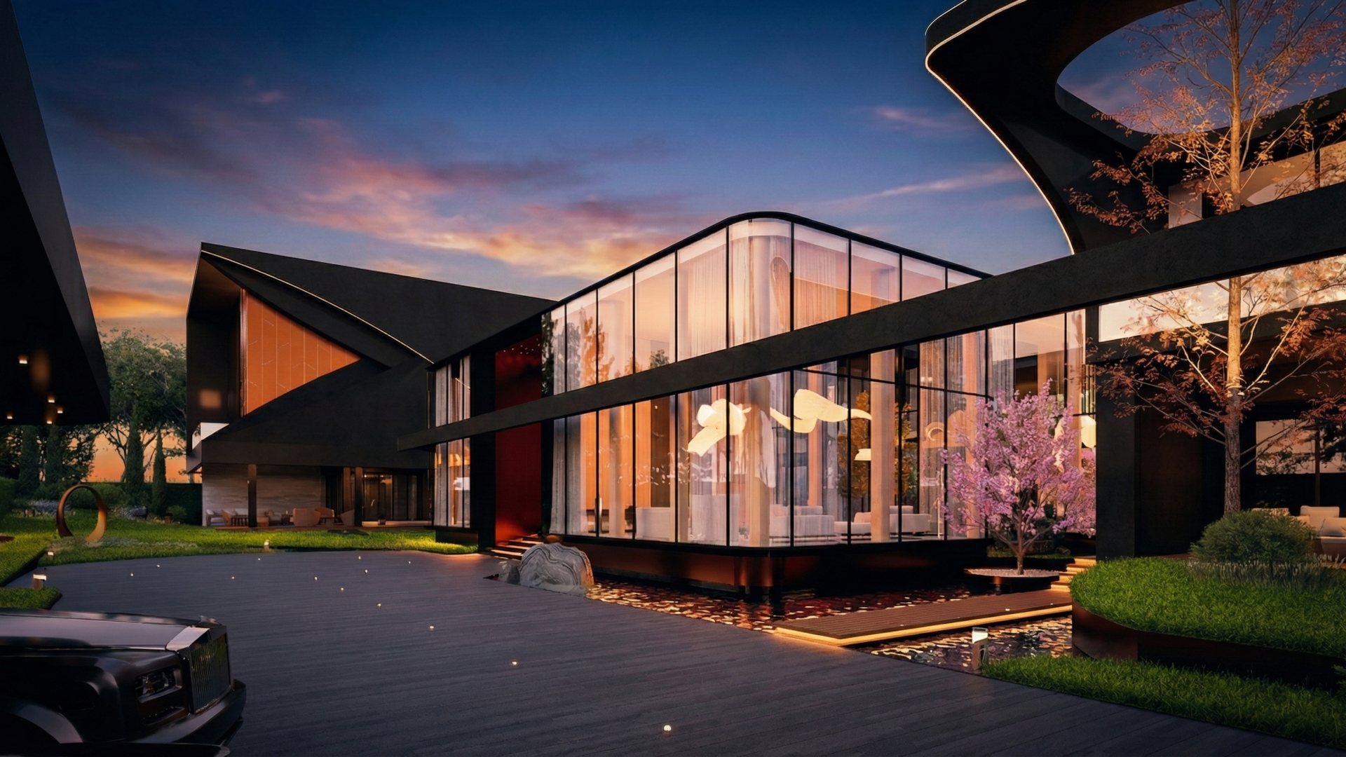 NX-806 is planned as a horizontally driven residence where clean lines, open volumes, and layered levels define the spatial rhythm. The layout flows effortlessly between formal and informal zones while still maintaining privacy for every family member. Tropical greens soften the bold geometry, creating a calming transition from outdoors to indoors. A long runway-style driveway leads to the entrance, giving the home an immediate sense of grandeur. Double-height volumes add vertical drama to the horizontal form, making the spaces feel open, airy, and visually connected throughout.