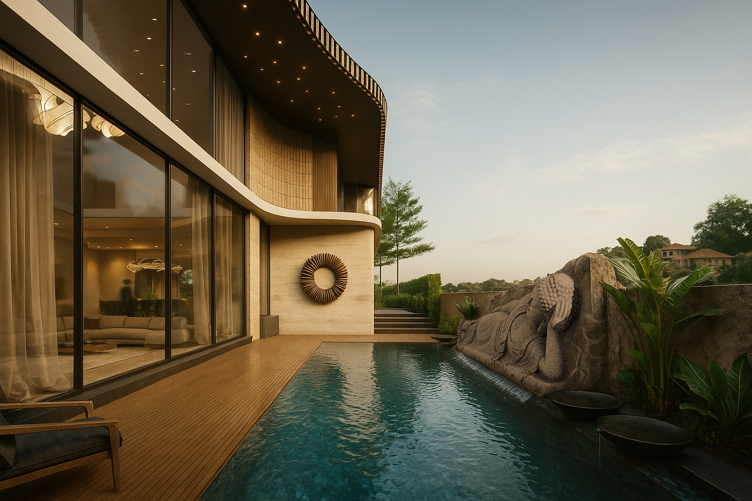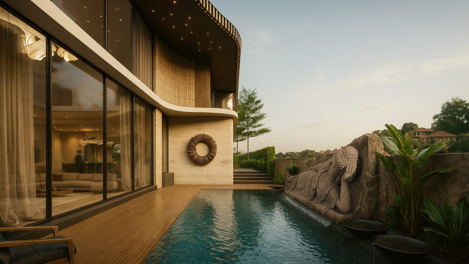 Envisioned as a modern residence where expansive glass walls and layered volumes dissolve the boundary between indoors and outdoors. Framing lush greenery and opening to a poolside retreat, the design creates a resort-like living within the city, defined by light, openness, and seamless connection to nature.