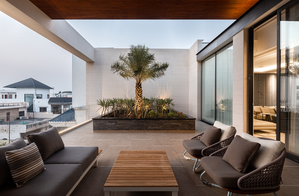 The Facade has the Indian Element in the form of Jaali that gives a distinctive identity that provides an additional layer of privacy to the house. Wide windows have been installed to add light and view, which also regulate ventilation. Moreover the palm tree is like a cherry on the cake which adds color and comfort to the terrace.
