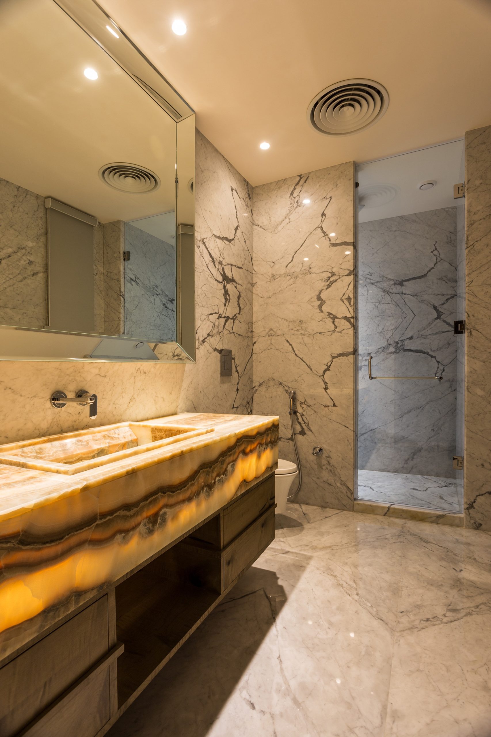 An exquisite dwelling, inspired by the latest trends in architecture, built to match the client’s aspirations and dreams, is located in the most opulent area of Jalandhar city. Having 8,000 square feet property, this modern structure dazzles with its agape exterior and enraptured interior. A long and horizontal house is a snazzy and careful equipoise of modern and functional. A beautiful mix of glass and louvers on the magnificent façade is letting light into the room and giving privacy in the area which we like to hide. Dramatic strips of warm lights, highlighters, and uplighters on elevation are highlighting the horizontal and vertical rhythms of the house. A well-designed front garden is highlighting the pulchritude and architectural traits of a house.